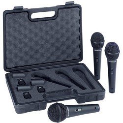 Three great-sounding dynamic microphones in an impact-resistant case, with stand adapters and mic clips. Click to enlarge. | What is a Dynamic Microphone? Dynamic mics have several advantages that make them ideal for live applications or recording amplified instruments. They're robust, resistant to moisture and can achieve high gain before feeding back. These microphones' cardioid pickup pattern is designed to capture the source signal, such as a guitar amplifier or vocalist, while shunning off-axis sound. Why the XM1800S? If you take a look at the stage in any club, you'll probably see at least three dynamic mics for the vocalists, with even more for the drums and amplifiers. This convenient package puts three great-sounding mics at your immediate disposal. XM1800S mics provide super-clean sound with minimal distortion, a slight presence lift in the critical mid-range, and an on/off switch for breaks in the set. What's in the Box Three Behringer XM1800S Microphones, Three Mic Clips With Stand Adapters, Protective Case |